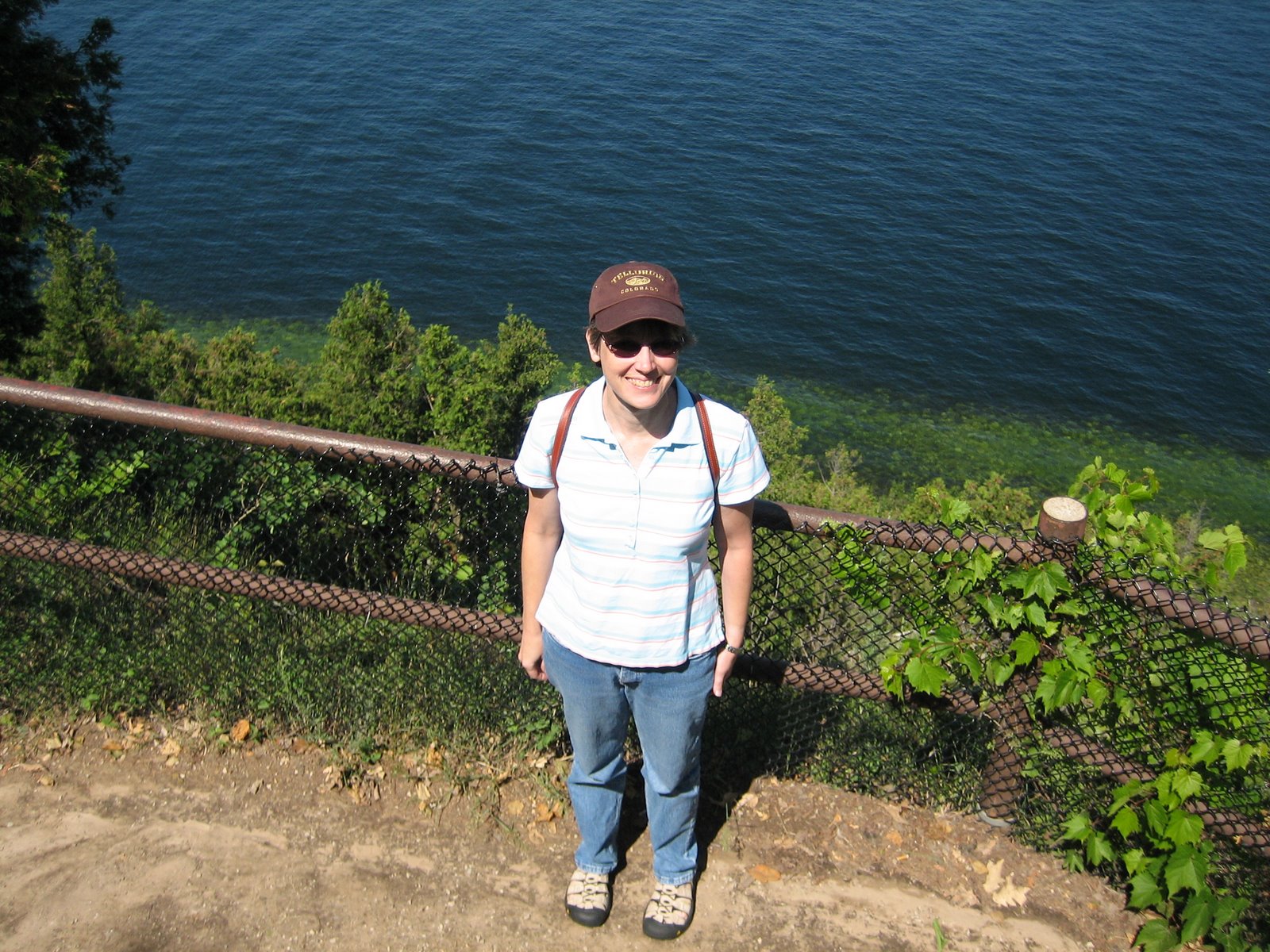 Pictures from top down – outdoor theatre, Kim at the wheel of “Hope”, a typical bay area in Door County and Kim at a scenic outlook.