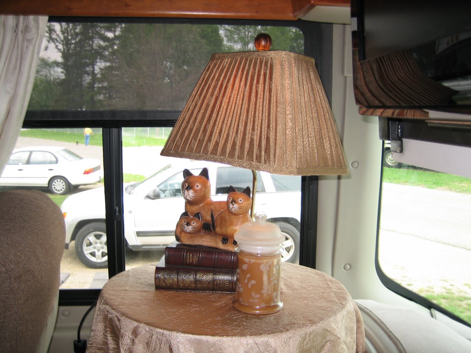 We have a Holiday Rambler motorhome (MH) and have joined their club called the Holiday Rambler RV Club (pretty creative huh?). The club has many chapters including one called the Rambling Diesel Pushers. We joined the chapter and they have an annual event in Goshen that is a maintenance seminar. People started rolling in last week and it finished last night. I believe there were about 250 coaches and lot of people will be leaving today. One really exciting opportunity for me was that several days before the rally began we were walking around looking at people’s coaches and we stopped to talk with a lady. It turned out she was in charge of some of the planning for the rally and said the regular speaker couldn’t be here and asked if I would bring the Sunday morning message. I spoke to about 120 people Sunday morning and really enjoyed getting to know the great people here. Kim and I have never felt so welcome and accepted as we did at this rally. RV’ers are generally friendly people that enjoy conversing and getting to know others. Kim and I have about six open invitations from people in different states to visit them and hook up at their place when on our trip this next year. They want to show us around. Kim and I attended many of the seminars and gained so much knowledge. Our unit has many of the same systems of a home and there are lots of things to learn to keep things operating smoothly. I attended classes on inverters (an electrical component that converts 12 volt DC to 120 volt AC), toilets, refrigerators, air conditioners, heat pumps, leveling jacks, slide outs and many more. Kim’s highlights were the interior decorating class, two cooking classes and she took a driving class and drove a coach with an instructor. I know I’ll never get the wheel back now. Just kidding. Kim did drive about 20 miles on the way back from Alabama last week. She did fine but doesn’t really want to drive the MH much though. I can understand. It’s quite a bit to handle if you’re not used to it. Another highlight was when Kim and I went through Sarah’s MH. She taught the decorating class and has really done lots of things to make her coach feel like home. The one thing that Kim and I did to make the coach feel more like home was to go to Wal-Mart and buy a small round wooden table with screw in legs (for $5.88). We threw away the legs, placed the table on the steering wheel that tilts so the wheel is level. Then we put a tablecloth on it and a lamp. It really gives the coach a homey feel.