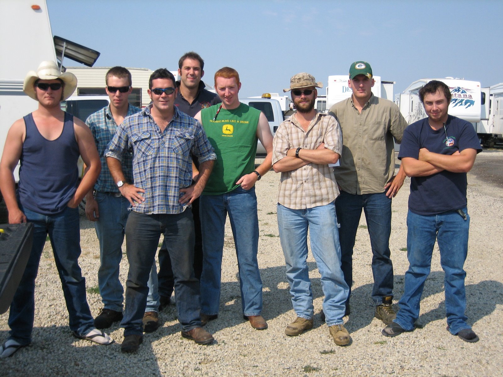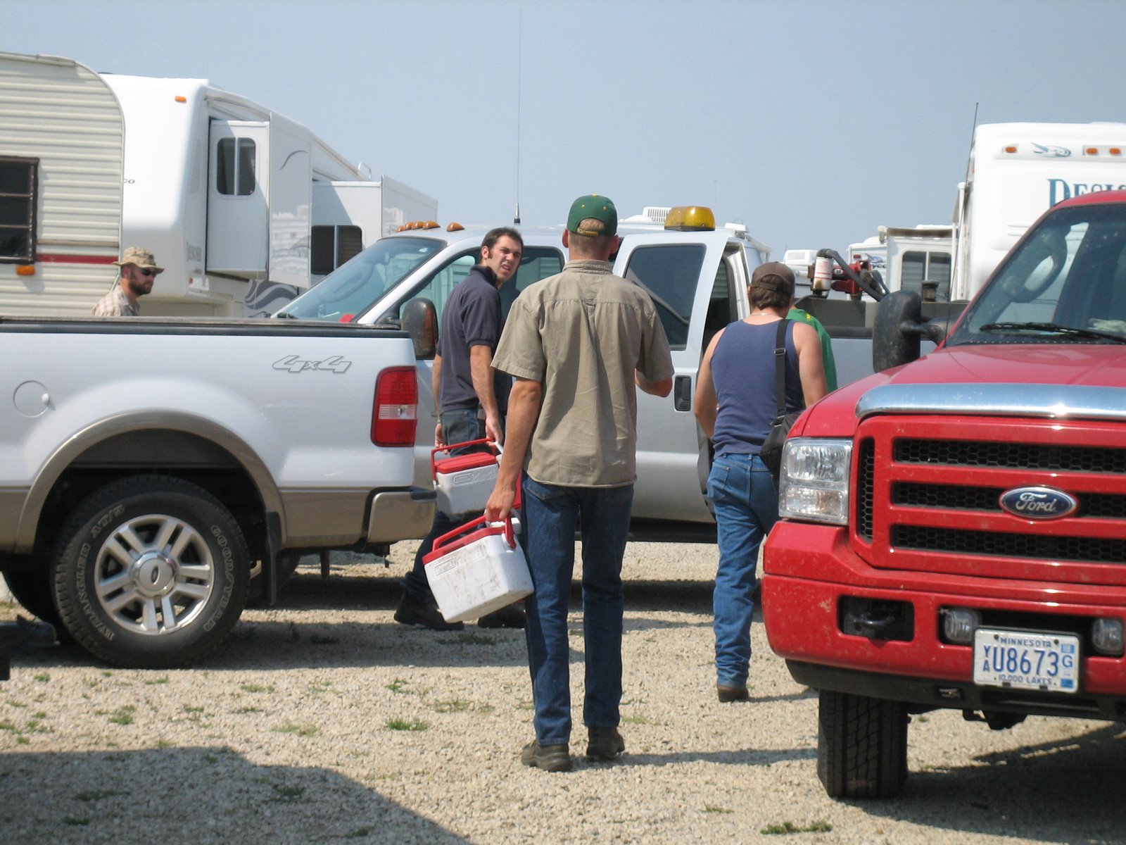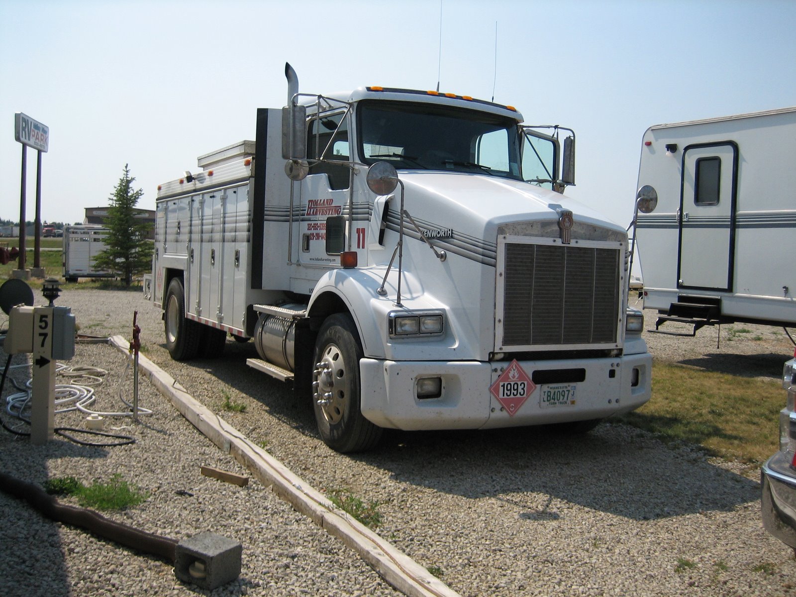 One of their two service trucksWe got to Swensen’s RV in Minot, ND this AM and there are several custom harvesting crews parked here in this campground. They were sitting around waiting for the heavy dew from the morning fog to leave the crops and so we walked over and spoke with them. The crew we met is from Holland Harvesting owned by Rob and Sue Holland (see their web page at hollandharvesting.com). They had some interesting facts (if I got them right). They have 7 trucks and 7 combines. They can harvest 1000 acres of wheat in a good day. They buy new combines each year and the second combine they buy next year will be their 100th combine. Rob’s wife Sue travels with them and cooks (and I suspect she does a lot of the things no one notices but need to be done to keep this show on the road). Everyone we talked to were so nice. The guys were polite and interesting to talk to. I told them I would treat them to Root Beer Floats and this may require a trip to the grocery store.