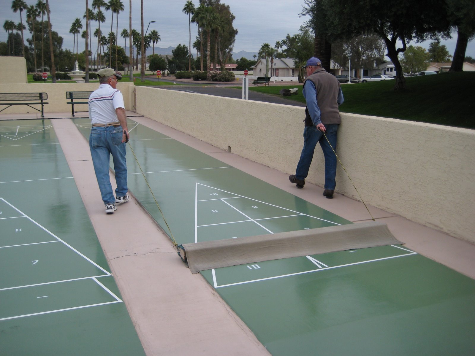 I went with dad Friday morning and we preped the shuffle board courts for the day. It was interesting to learn how they do it. Here’s dad (left) and a friend cleaning the courts.